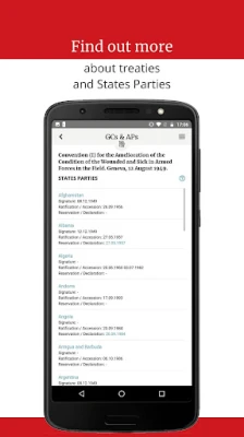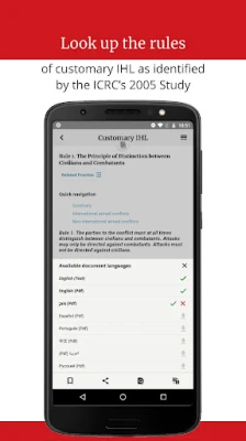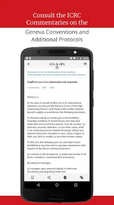 This application (app) provides offline access to more than 80 treaties and other documents relating to international humanitarian law (IHL) – most notably, the Geneva Conventions and their Additional Protocols, the ICRC’s original and updated Commentaries on the Conventions and Additional Protocols, the rules of customary IHL identified by the ICRC’s 2005 study on customary IHL and various ICRC documents on IHL. The app interface can be set to any of the eight languages listed in the settings of the side menu, under “App language”: Arabic, Chinese, English, French, German, Portuguese, Russian and Spanish.
